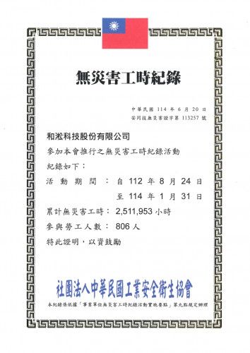 和淞參加社團法人中華民國工業安全衛生協會推行之無災害工時紀錄...