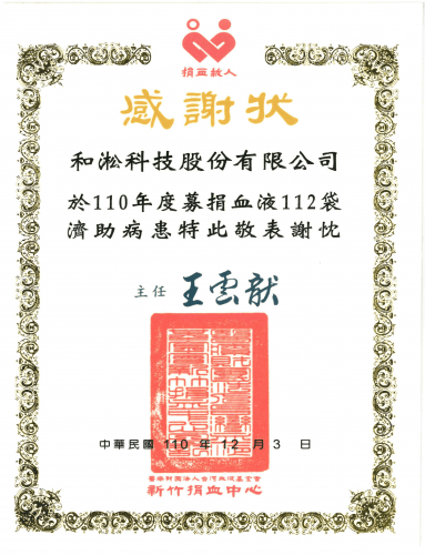 2021.12.06 榮獲新竹捐血中心頒發110年度感謝狀