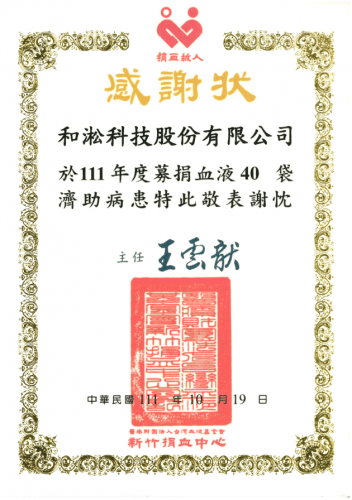 2022.11.17 榮獲新竹捐血中心頒發111年度感謝狀